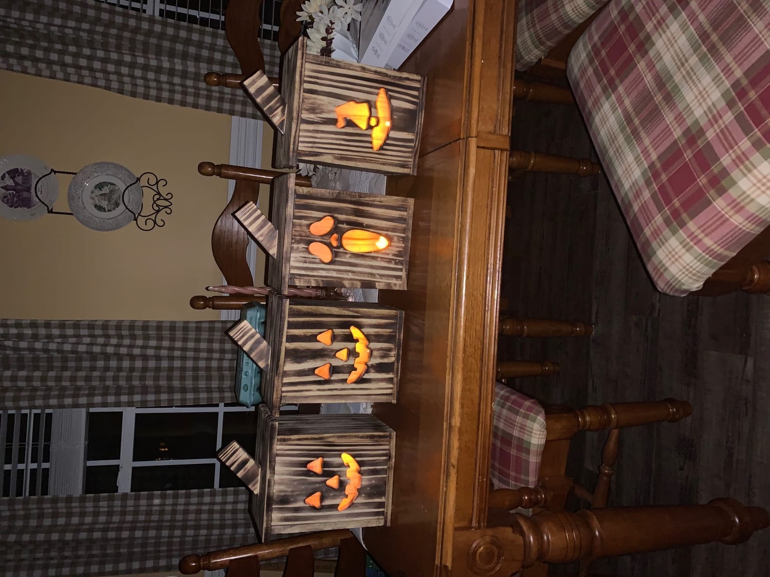 These can be customized to your choice. We have stained like the ghost lantern, or wood burned like the 4 in the last picture. Take your pick.