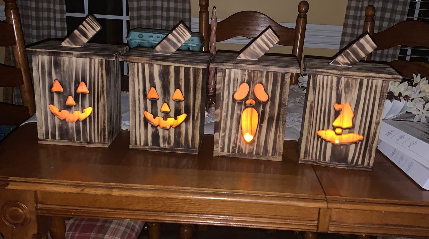 Checkout the Halloween lanterns! Aren’t they cutest! We have plain pumpkin faces, scary pumpkin faces, a witch’s hat, a scary ghost face and even bats! We can stain them, paint them and wood burn them. They all come with a battery powered light! And you are not going to believe the price! $15 each! Yep, that’s right they are only $15 each and they are selling like crazy! That’s why it has taken me so long to make this blog post! I been busy staining and painting. Allen does the wood burn, and they look amazing!